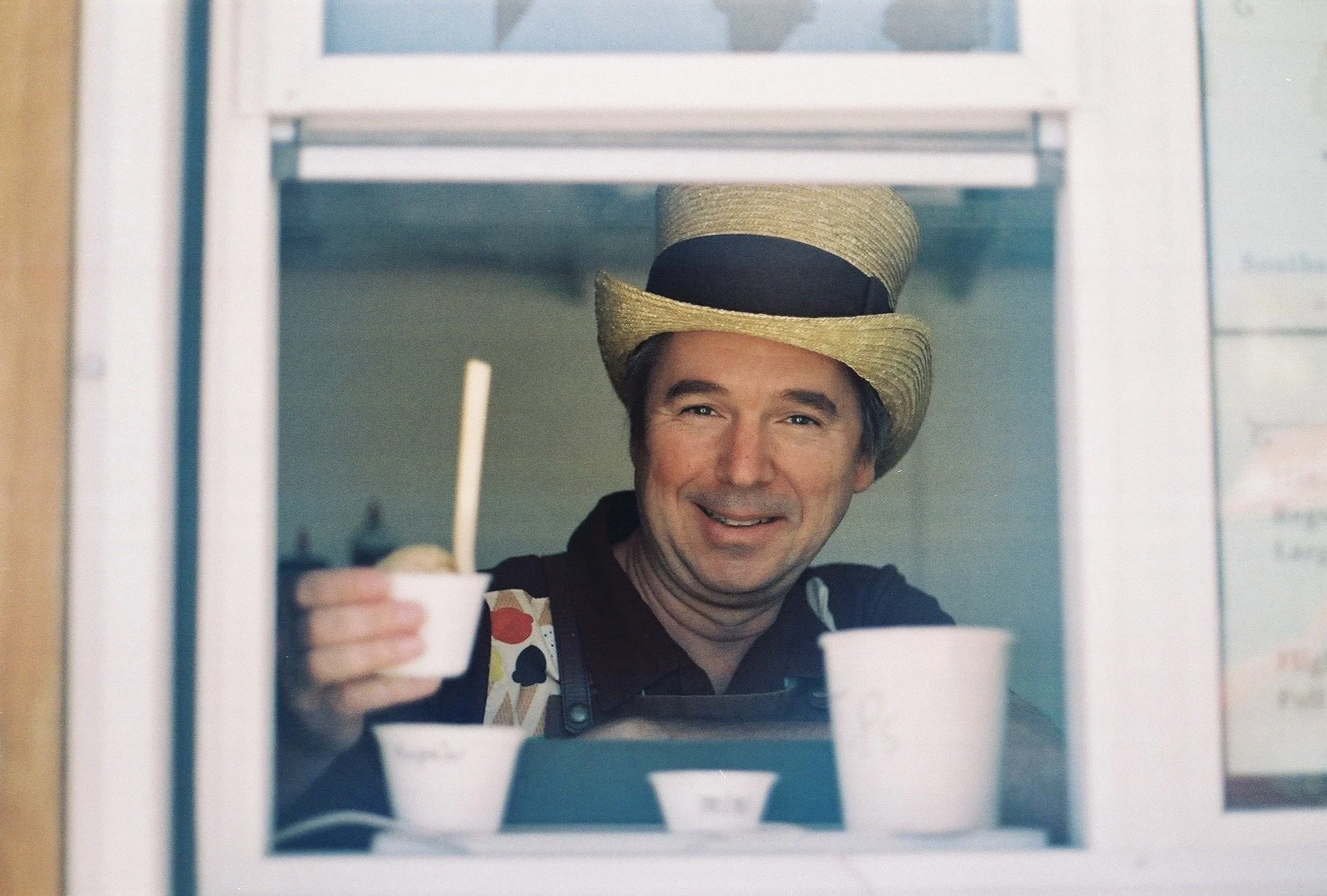 Jolly is the brain and the uh muscle of this operation. He makes the ice cream. He hauls the ice cream around. He’s the one wearing the top hat in the ice cream trailer most of the time.
